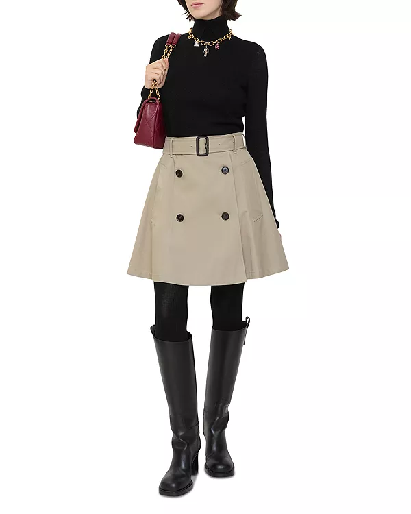 Переосмысление фирменной дождевой одежды Burberry: расклешенная мини-юбка-тренч из водоотталкивающего хлопкового габардина. Ткань соткана на фабрике Burberry в Йоркшире.
