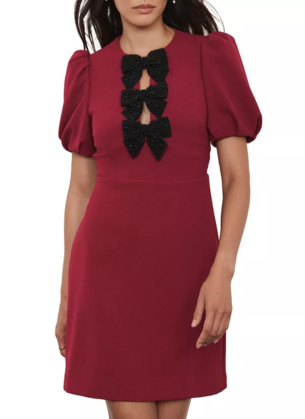 Платье мини-силуэта с круглым вырезом, вырезом-капелькой спереди, отделкой в виде банта из бисера, короткими рукавами-фонариками и застежкой-молнией сзади.