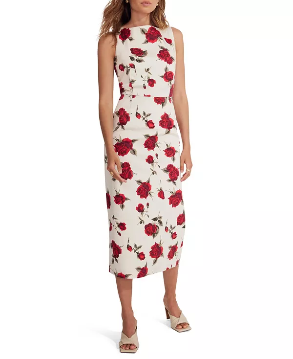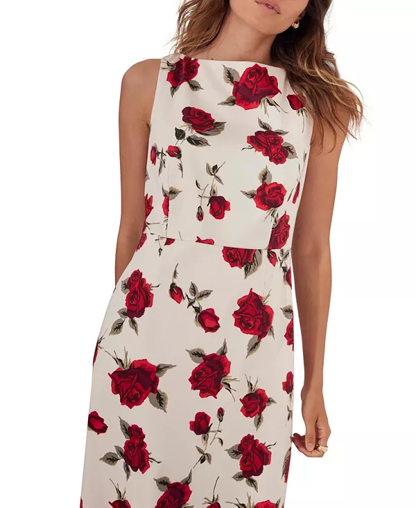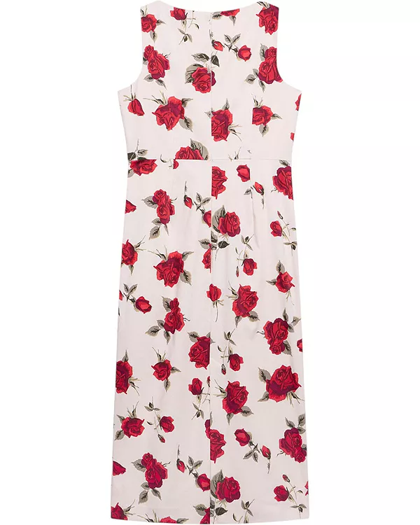 Платье без рукавов средней длины с принтом в виде красных роз, круглым вырезом горловины, разрезом сзади и застежкой-молнией.