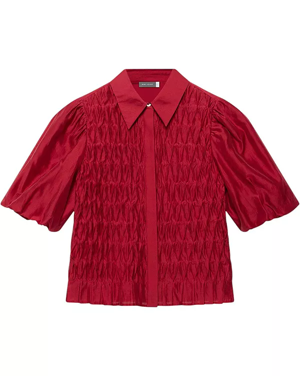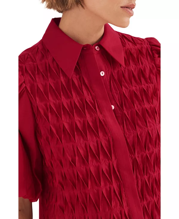 Рубашка-рубашка красного цвета с классическим воротником, короткими рукавами-фонариками и потайной застежкой на пуговицы спереди.