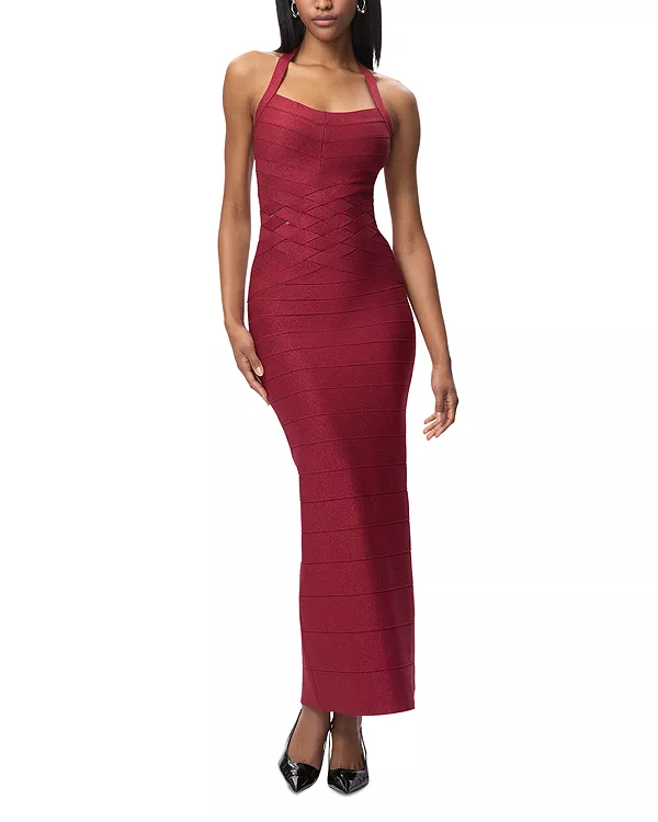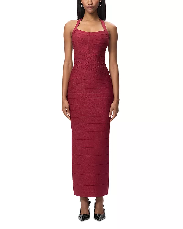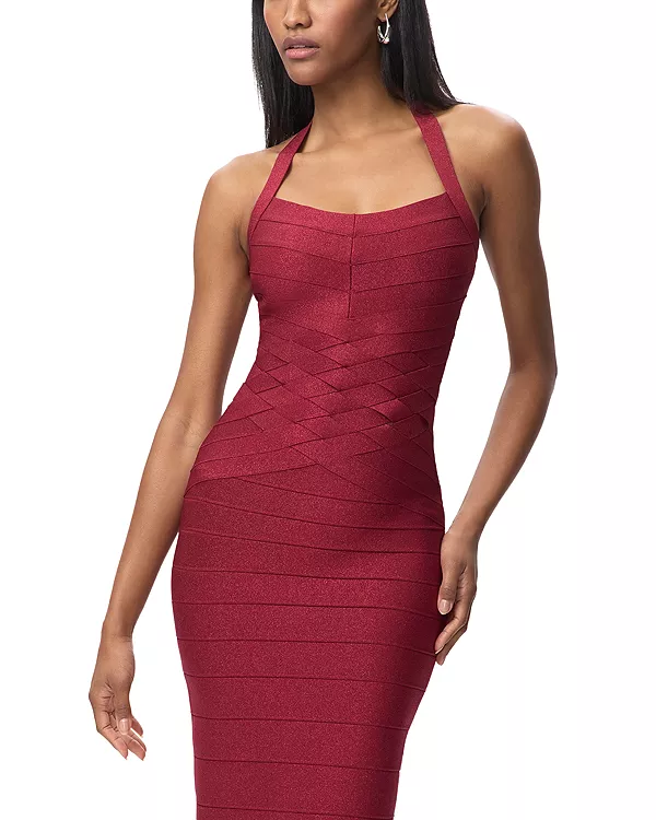 Силуэт платья Maxine от Hervé Léger с градиентным переходом цвета из коллекции Resort '26 (образ №2). Платье выполнено из металлизированной ткани, имеет лиф в стиле бандаж, воротник-халтер и плетеную отделку на талии.
