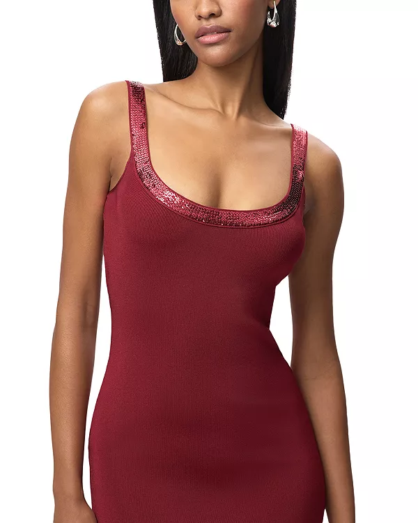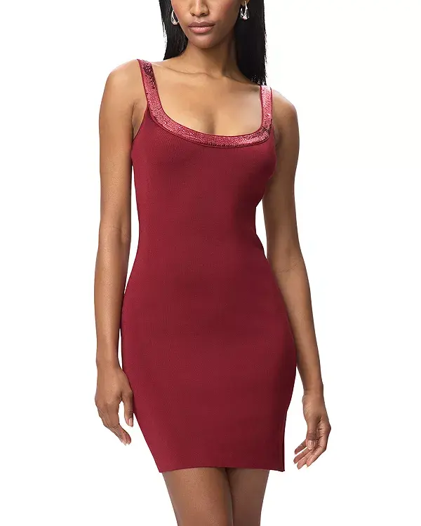 Новинка коллекции Resort '26, платье Cove от Hervé Léger - это облегающее мини-платье из плотного трикотажа. Силуэт украшен вышитым пайетками вырезом-лодочкой и застежкой-молнией по центру спины.