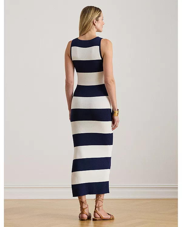 Платье-свитер от Lauren Ralph Lauren, связанное из мягкой хлопковой смеси, украшено полосками в морском стиле, имеет облегающий силуэт и разрез на юбке для свободы движений.