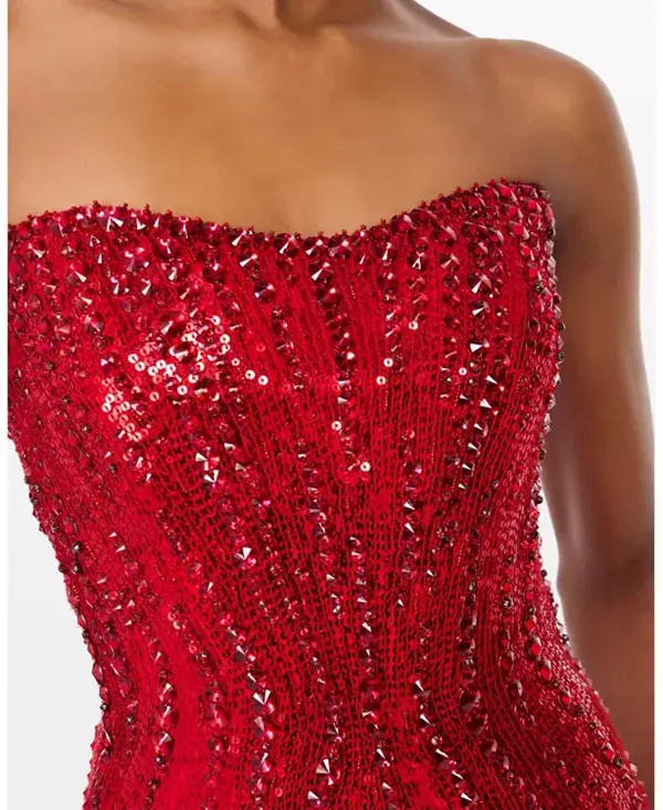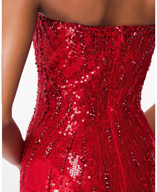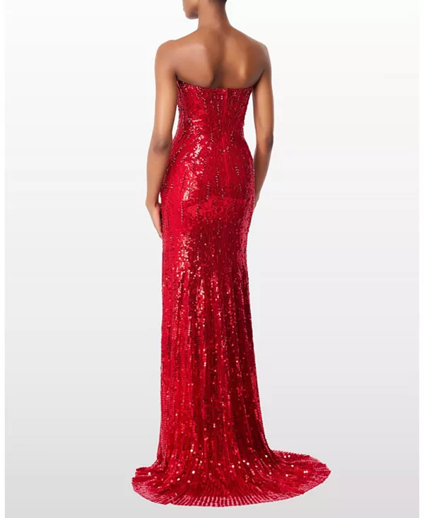 Привлеките всеобщее внимание в этом потрясающем платье без бретелей - сверкающем шедевре гламура и изысканности. Украшенное замысловатыми пайетками, ниспадающими от облегающего лифа до подола в пол, это платье создает сияющий, переливающийся на свету эффект. Обтекаемый силуэт прекрасно подчеркивает фигуру, а декольте без бретелей добавляет нотку вневременного очарования и современной элегантности.