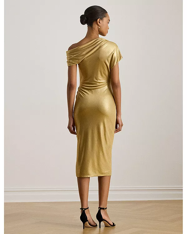 Это эффектное коктейльное платье, сшитое из металлизированного трикотажа, придающего ему сияние, отличается асимметричным вырезом и сборками спереди, которые подчеркивают его облегающий силуэт.