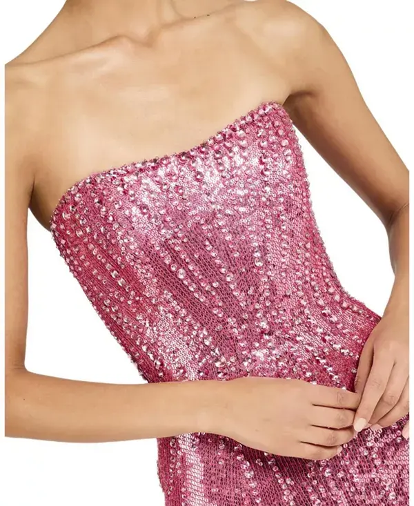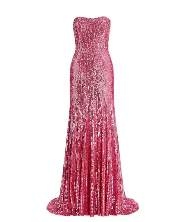 Привлеките всеобщее внимание в этом потрясающем платье без бретелей - сверкающем шедевре гламура и изысканности. Украшенное замысловатыми пайетками, ниспадающими от облегающего лифа до подола в пол, это платье создает сияющий, переливающийся на свету эффект. Обтекаемый силуэт прекрасно подчеркивает фигуру, а декольте без бретелей добавляет нотку вневременного очарования и современной элегантности.