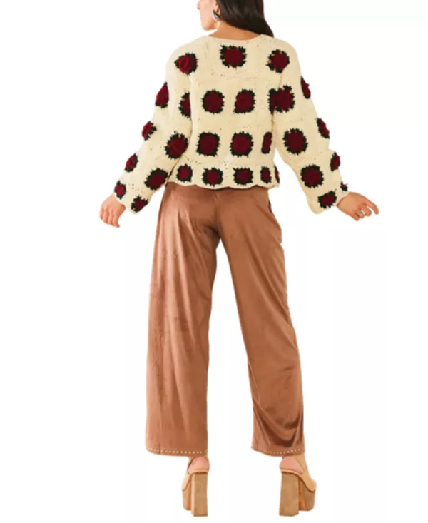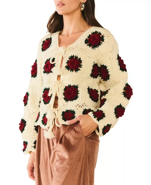 Бренд: Eddy Цвет: бежевый Любовное послание винтажной находке. Вдохновленный найденной нами вещью, переосмысленной в мягкой шерсти, этот вязаный кардиган с завязками спереди привносит очарование старого мира в современность. Розетки в виде «бабушкиных» квадратов расцветают на фоне цвета слоновой кости. V-образный вырез и свободные рукава, дополненные завязками с кисточками, застегивающимися спереди.