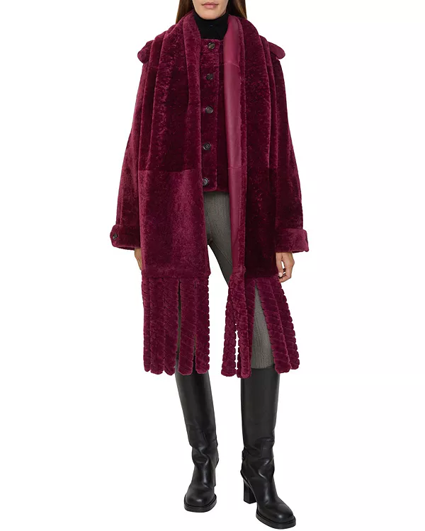 Однобортный жакет, изготовленный в Италии из мягкой двухсторонней овчины. Модель без воротника украшена погонами, вдохновленными фирменным тренчем Burberry, и съемным шарфом с крупной бахромой. Впервые представлен на показе зимней коллекции Burberry 2025 года и имеет стандартный крой.