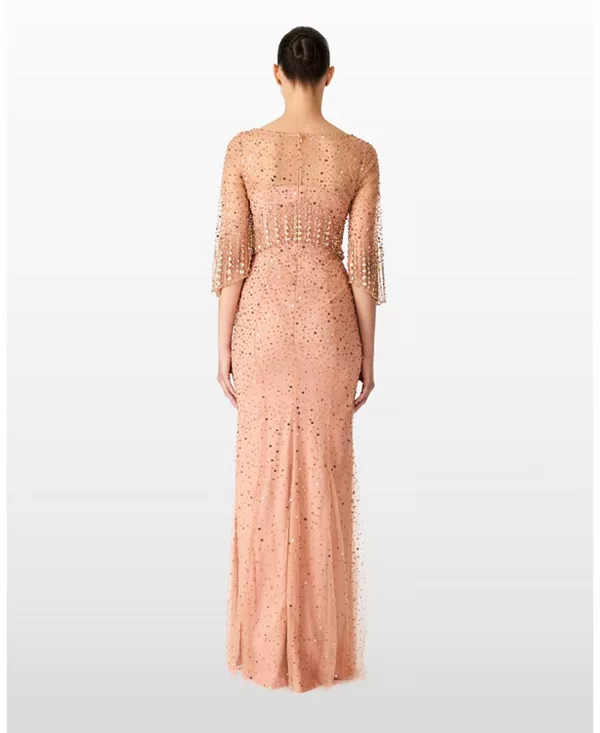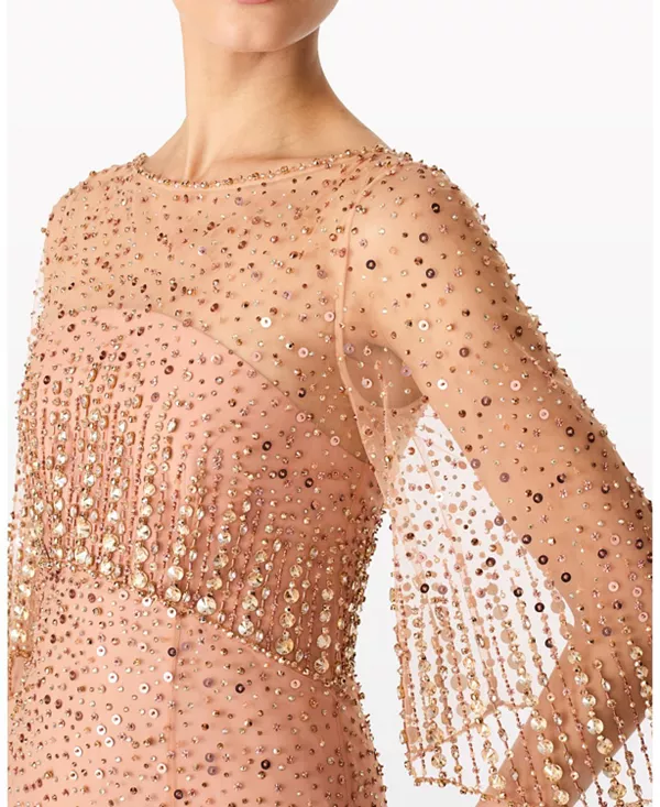 Это платье сочетает в себе полупрозрачные слои с элегантной структурой, создавая изысканный образ с ноткой дерзости. Силуэт лаконичный и минималистичный, контрастирует с украшенной отделкой, переходящей в рукава три четверти. Кристаллы, нанесенные вручную, ниспадают от выреза и собираются на талии, а затем рассеиваются по юбке, создавая объем, текстуру и движение. Современный вечерний образ с умеренным блеском.