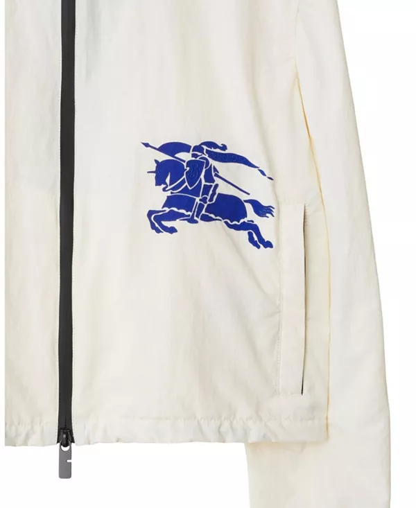 Бренд: Burberry Цвет: белый Куртка с капюшоном из водоотталкивающего нейлона, украшенная аппликацией с изображением рыцаря-всадника. Легкая модель свободного кроя с укороченным низом. Часть коллекции Burberry Classics - основы гардероба с уникальным стилем Burberry.