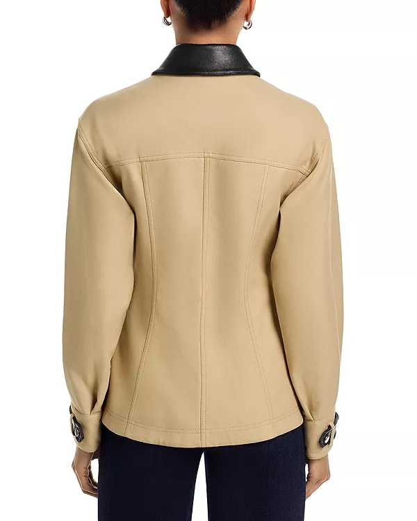 Бренд: Veronica Beard Цвет: бежевый Изысканная интерпретация дождевика. Куртка Talla от Veronica Beard, изготовленная из водоотталкивающего хлопка цвета хаки, имеет приталенный силуэт с баской, вертикальными рельефными швами и боковыми вставками, подчеркивающими талию. Застежка на кнопках с потайной молнией, наклонные накладные карманы, а также воротник и манжеты с кожаной отделкой завершают образ. Стильная в любую погоду, ее можно носить поверх повседневной одежды для мгновенного создания элегантного образа.