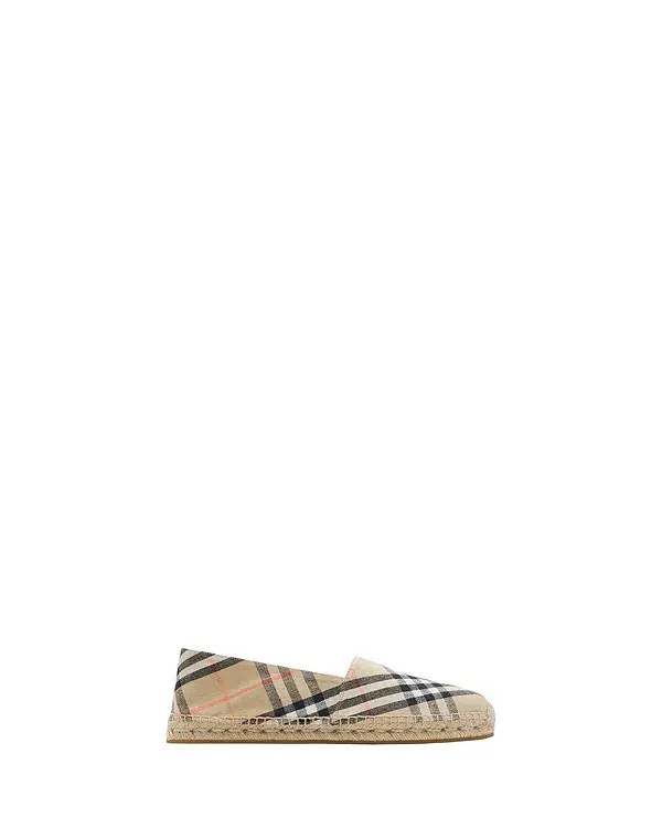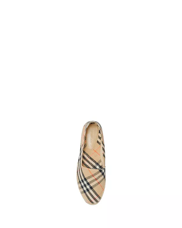 Эспадрильи из эластичного льна с клетчатым узором Burberry и подкладкой из материала того же цвета. Легкая резиновая подошва украшена тисненым рисунком «Всадник-рыцарь».