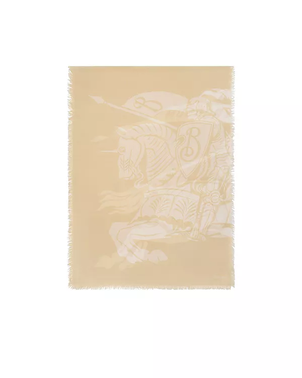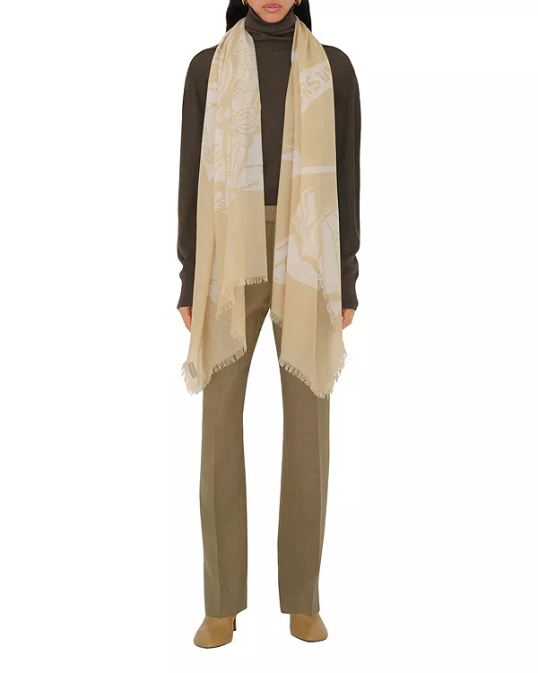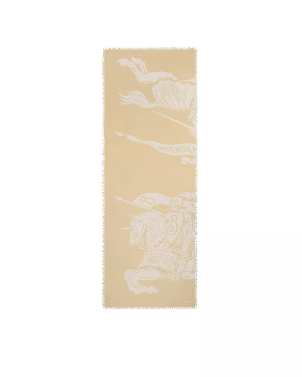 Шарф из шерсти итальянского производства, украшенный трафаретной печатью с изображением рыцаря-всадника и нашим логотипом. Легкий шарф отделан изящной бахромой.