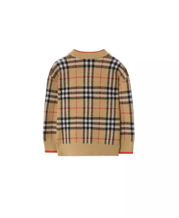 Кардиган с V-образным вырезом из мягкой шерсти, связанный фирменным клетчатым узором Burberry в песочно-бежевом цвете. Дизайн дополнен трикотажной отделкой в рубчик ярко-оранжево-красного цвета.