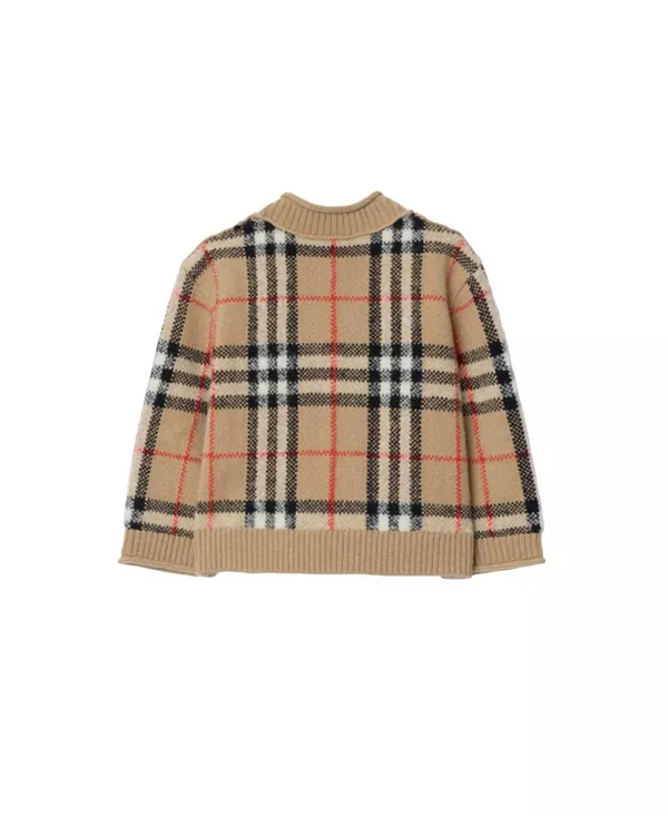 Кардиган из шерсти и кашемира, связанный фирменным клетчатым узором Burberry в песочно-бежевом цвете. V-образный вырез отделан ребристыми манжетами.