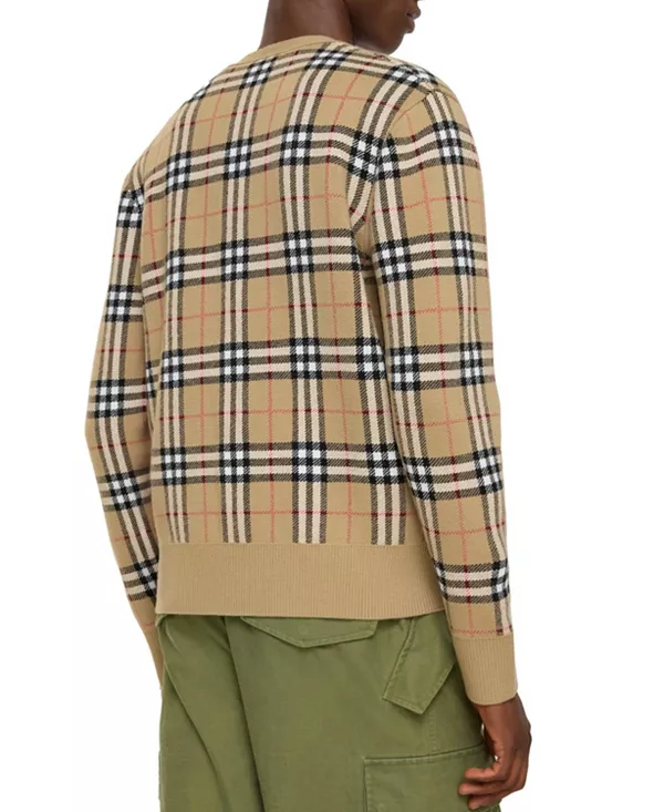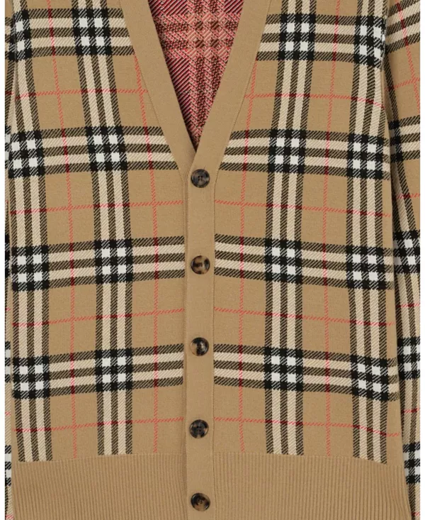 Кардиган из легкой хлопковой шерсти с добавлением эластана, прямого кроя. Узор выполнен жаккардовой вязкой с фирменной клеткой Burberry в песочно-бежевом цвете.