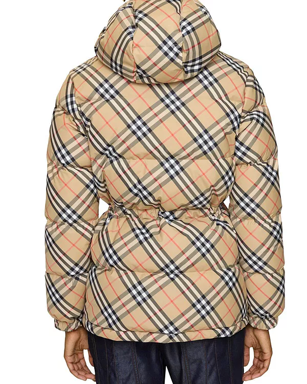 Бренд: Burberry Цвет: бежевый Пуховая куртка с капюшоном в фирменном клетчатом узоре Burberry. Модель прямого кроя с регулируемым поясом на шнурке, застежкой-молнией и фирменным знаком «Рыцарь» - архивным мотивом, впервые появившимся на сумках Burberry в 1980-х годах.