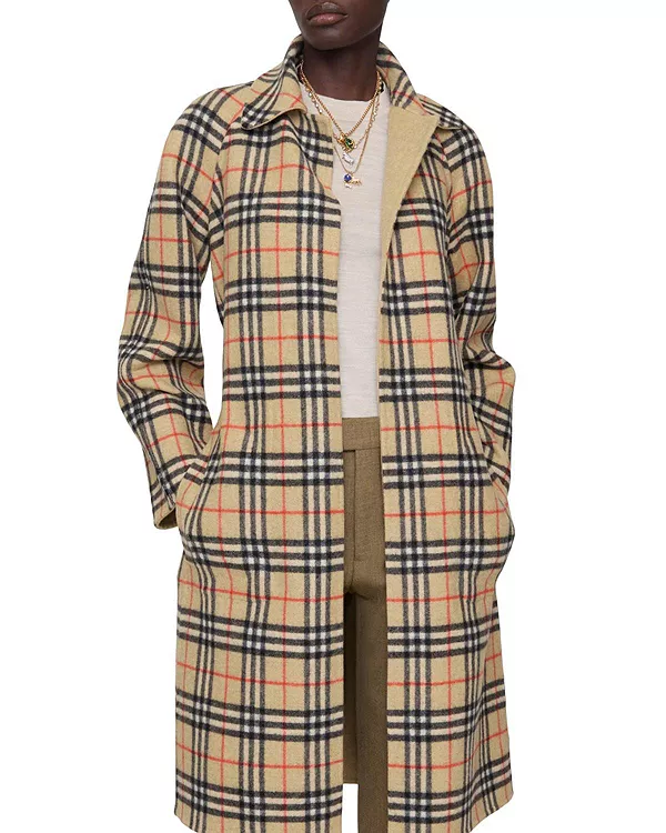 Пальто-халат, изготовленное в Италии из двухсторонней шерсти, с одной стороны однотонное, с другой - клетчатый узор Burberry в фирменном песочно-бежевом цвете. Модель имеет стандартный крой и съемный пояс для регулировки формы.