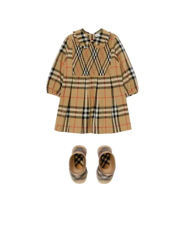 Платье с длинными рукавами из хлопкового поплина с клетчатым узором Burberry. Модель отличается изящным воротником «Питер Пэн», присборенным лифом и юбкой со сборками.