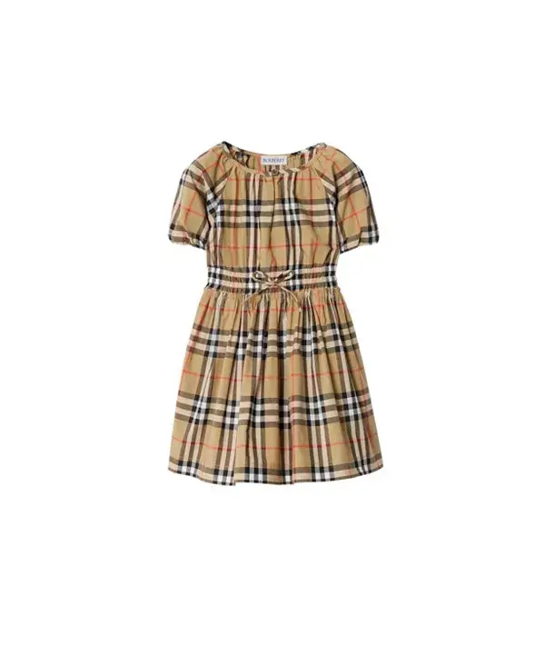 Платье из легкого хлопка с фирменной клетчатой тканью Burberry песочно-бежевого цвета. Модель имеет короткие рукава-фонарики и эластичную присборенную талию с бантом.