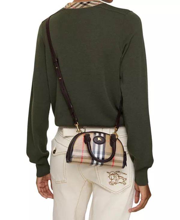 Бренд: Burberry Цвет: бежевый Наша мини-сумка для боулинга Highlands, вдохновленная природой, изготовлена в Италии из смеси хлопка и льна, отделана гладкой телячьей кожей и имеет хлопковую подкладку. Ткань жаккардового плетения с клетчатым узором Burberry и имеет покрытие, вдохновленное дождевой одеждой. Сумку можно носить через плечо с помощью съемного ремешка, а завершает дизайн наш фирменный знак «Рыцарь» - архивный мотив, впервые появившийся на сумках Burberry в 1980-х годах.