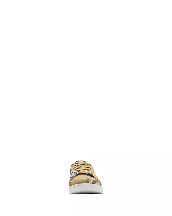 Бренд: Burberry Цвет: бежевый Наши новые фирменные кроссовки Set - это минималистичная модель, созданная для повседневной роскоши. Низкие кроссовки изготовлены в Италии из нейлоновой смеси и украшены ярким клетчатым узором Burberry в фирменном песочно-бежевом цвете. Замшевая нашивка на язычке отделана нашим дизайном «Рыцарь-наездник» и логотипом.