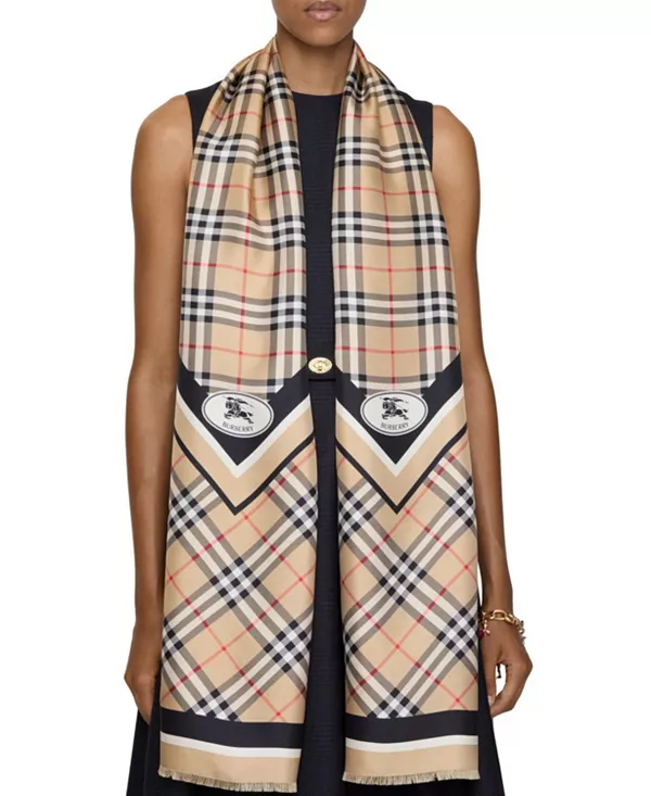 Бренд: Burberry Цвет: бежевый Прямоугольный шарф, изготовленный в Италии из шелкового твила с клетчатым узором Burberry. Дизайн обрамлен контрастными полосами и нашим фирменным знаком Knight, архивным мотивом, впервые появившимся на сумках Burberry в 1980-х годах.