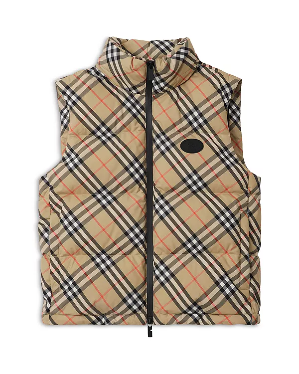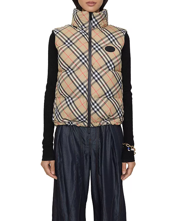 Пуховый жилет из водоотталкивающей ткани в клетку Burberry, прямого кроя, наполненный гусиным пухом и перьями. Модель имеет убирающийся капюшон для защиты от непредсказуемой погоды и украшена фирменным знаком Knight, архивным мотивом, впервые использованным в 1980-х годах.