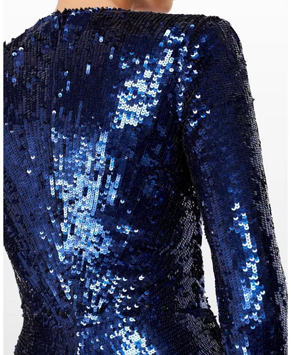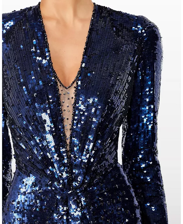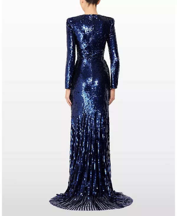 Бренд: Jenny Packham Цвет: синий Это поистине эффектное платье создано, чтобы очаровать с первого взгляда. Скроенное в элегантном, удлиненном силуэте, оно отличается глубоким декольте и выразительными плечами, которые скульптурно обрамляют фигуру. Поверхность полностью инкрустирована светоотражающими пайетками, переходящими в блестящие пайетки, которые каскадом ниспадают по юбке и элегантно ниспадают по подолу. Благодаря своей утонченной драматичности и смелому сиянию, это вечерний образ, созданный для того, чтобы быть в центре внимания.