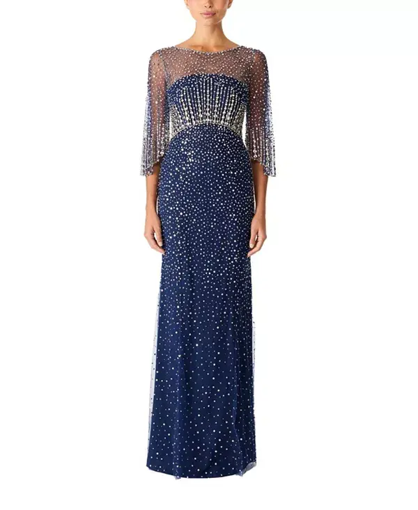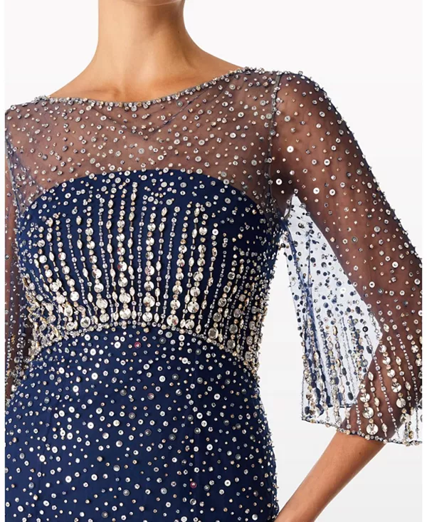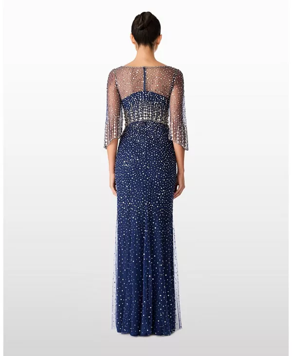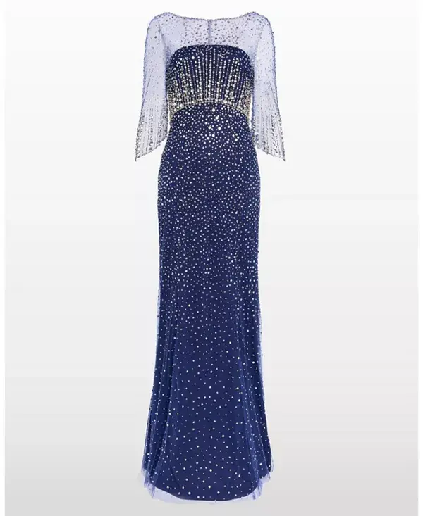 Это платье сочетает в себе полупрозрачные слои с элегантной структурой, создавая изысканный образ с ноткой дерзости. Силуэт лаконичный и минималистичный, контрастирует с украшенной отделкой, переходящей в рукава три четверти. Кристаллы, нанесенные вручную, ниспадают от выреза и собираются на талии, а затем рассеиваются по юбке, создавая объем, текстуру и движение. Современный вечерний образ с умеренным блеском.