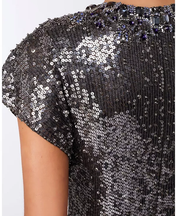 Платье Odisha - воплощение изысканного гламура. Оно выполнено в струящемся силуэте и переливается пайетками по всей поверхности, отражая свет под любым углом. Мягкие рукава-крылышки и слегка расклешенный подол добавляют движения и элегантности, а эффектный вырез, украшенный пайетками в тон, тонко отсылает к винтажной высокой моде. Создано, чтобы очаровывать своей сдержанной уверенностью.