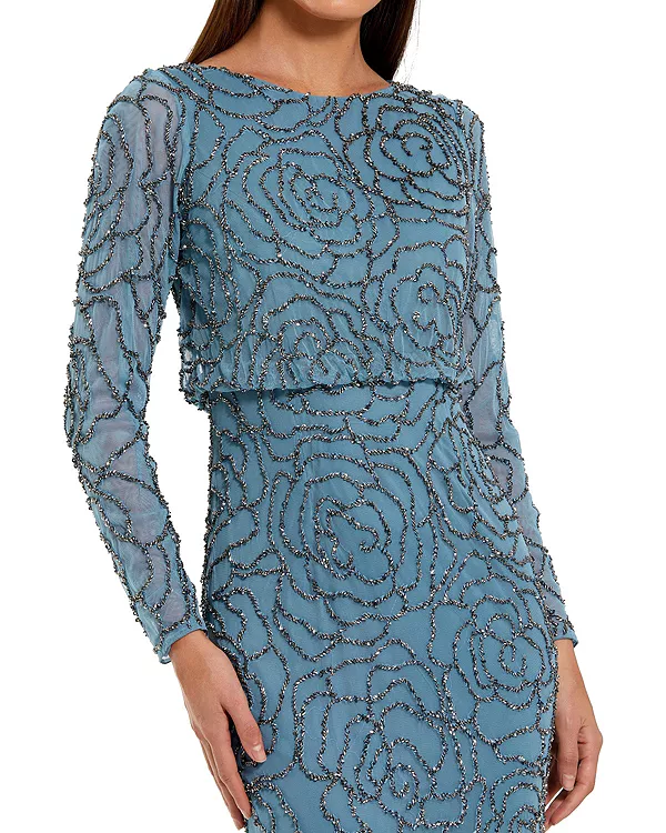 Платье-Блузон с длинными рукавами, украшенное бисером и сеткой. Mac Duggal, синий