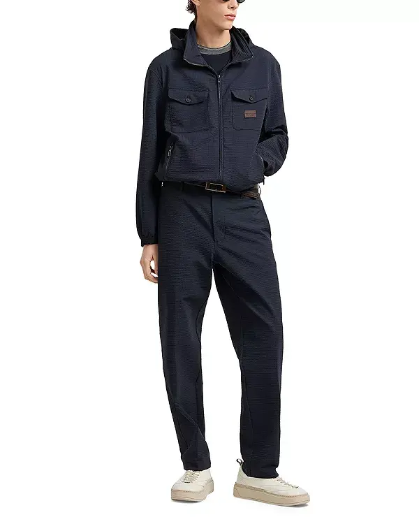 Ткань сирсакер с кожаной нашивкой с логотипом на груди