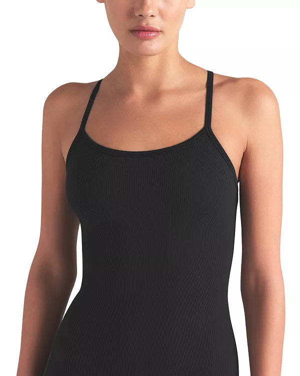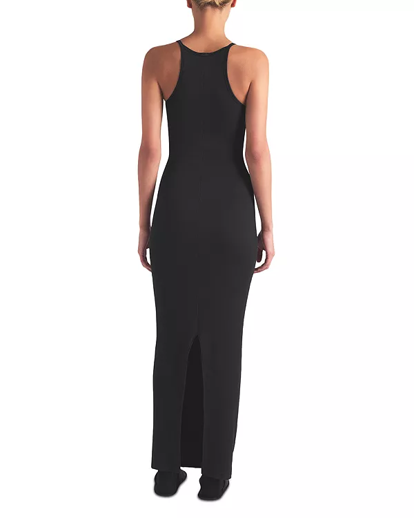 Бренд: Skims Цвет: черный Хлопок еще никогда не выглядел так шикарно. Этот универсальный, облегающий силуэт выполнен из мягкой ребристой ткани SKIMS, которая дышит и комфортно облегает тело. Он имеет элегантный вырез-лодочку, слегка зауженную спинку-борцовку с логотипом SKIMS и гладкую окантовку вдоль бретелей и пройм. Подол во всю длину имеет разрез по центру спины для удобства ходьбы.