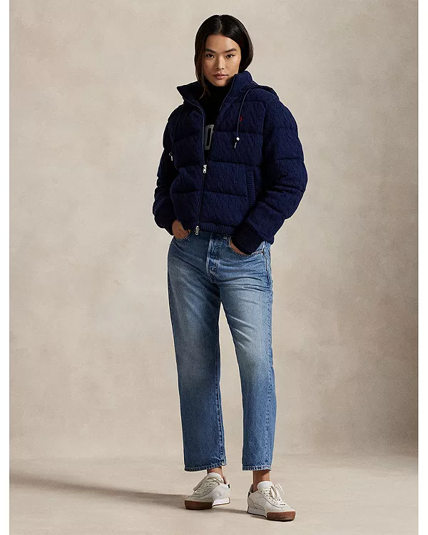 Эта куртка, сочетающая классический мотив крупной вязки Ralph Lauren со стеганой утепленной конструкцией, выполнена из итальянской шерсти и кашемира и имеет съемный капюшон на шнурке. Вышитый пони добавляет фирменный акцент на левой стороне груди.