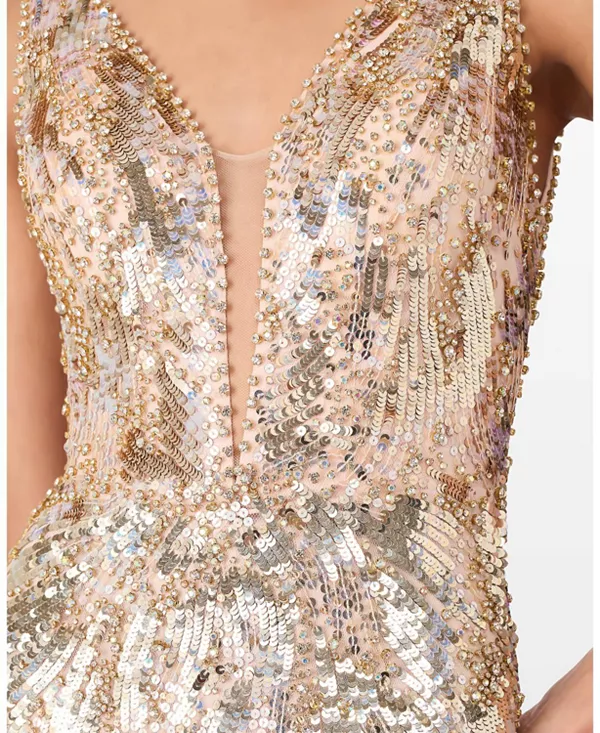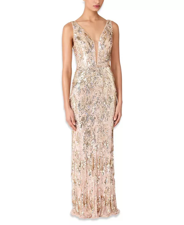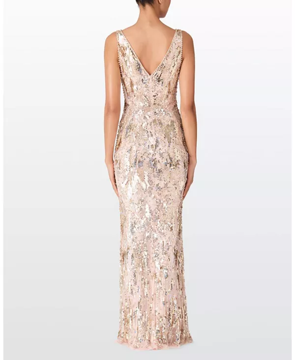 Бренд: Jenny Packham Цвет: белый Это платье с глубоким V-образным вырезом и широкими бретелями полностью украшено пайетками в тон, расположенными в замысловатом струящемся узоре. Приталенный лиф переходит в юбку до пола, обеспечивая баланс между структурой и струящейся легкостью. Легкая прозрачность в области декольте добавляет изысканности. Идеально подходит для торжественных мероприятий, официальных приемов или выходов на красную дорожку.
