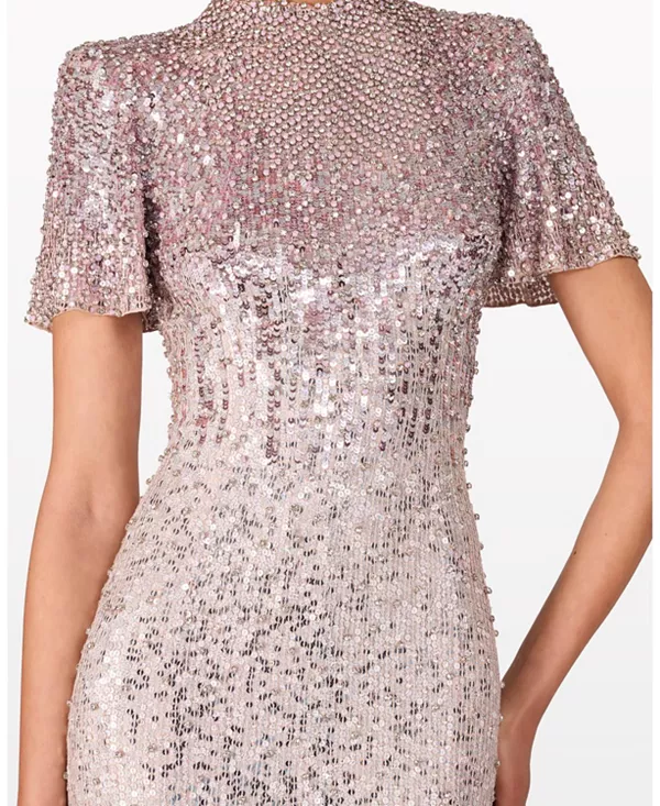 Это платье, полностью покрытое вышивкой, создано для того, чтобы привлекать внимание. Структурированные плечи и высокий вырез создают выразительный, скульптурный силуэт, а юбка до пола добавляет легкости. Короткие рукава обеспечивают защиту, не нарушая современный силуэт. Идеальный вариант для церемоний награждения, официальных приемов или вечерних гала-вечеров.