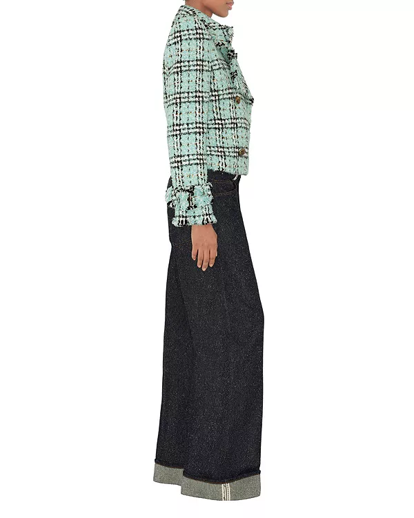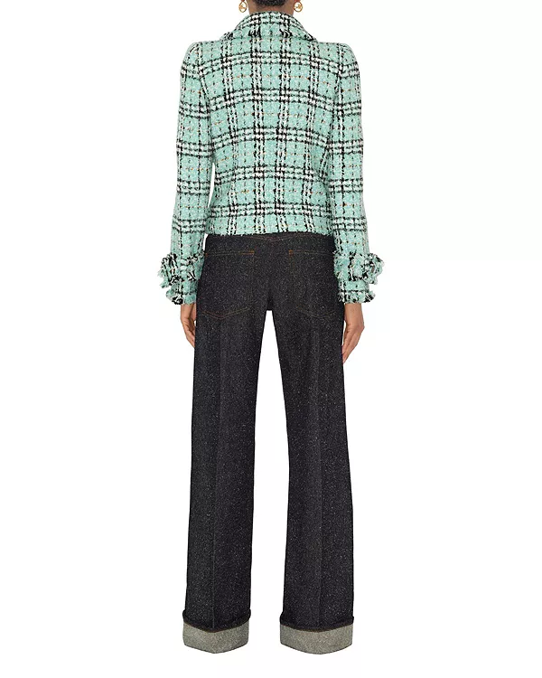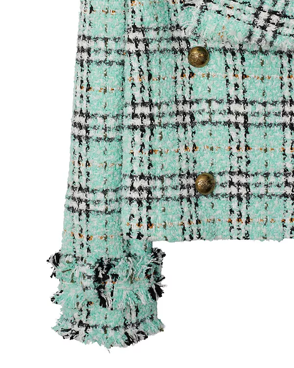 Бренд: Burberry Цвет: синий Двубортный жакет из букле, изготовленный из смеси хлопка и нейлона в Англии с клетчатым узором Burberry. Модель имеет приталенный крой, структурированные плечи и украшена выпуклыми пуговицами Equestrian Knight Design с эффектом состаривания.