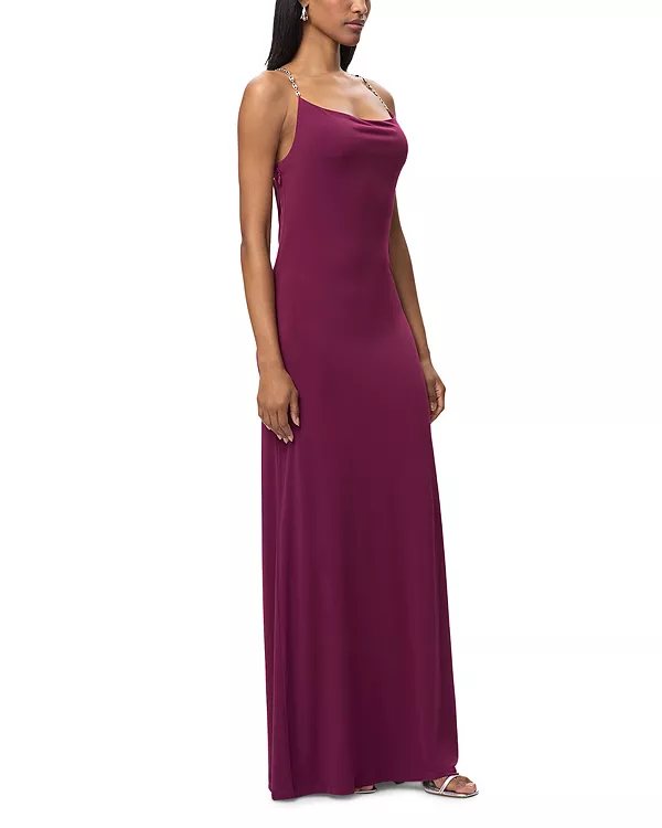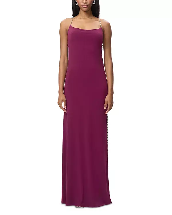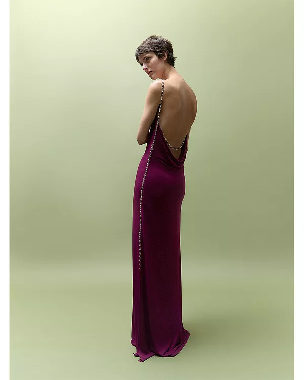 Платье Aviva от Hervé Léger, представленное в образе № 15 из лукбука коллекции Resort '26, сшито из облегающего фирменного трикотажа с серебряными цепочками. Платье имеет слегка драпированный вырез и эффектную низкую спинку с драпировкой, выполнено на подкладке и дополнено высоким боковым разрезом и боковой молнией.