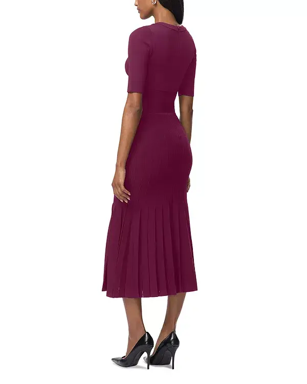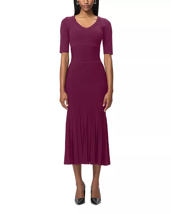 Платье Demi от Hervé Léger, новинка коллекции Resort '26, представляет собой приталенное платье-трапецию миди из трикотажа в рубчик средней плотности. Оно имеет V-образный вырез, рукава до локтя и плиссированные детали с прозрачными вставками.