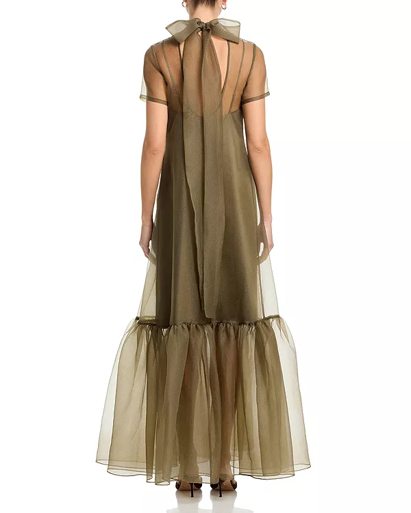 Платье Calluna - это платье из органзы с высоким воротником, открытой спиной и функциональным поясом на шее. Модель отличается нарядной многоярусной юбкой с оборками по низу.