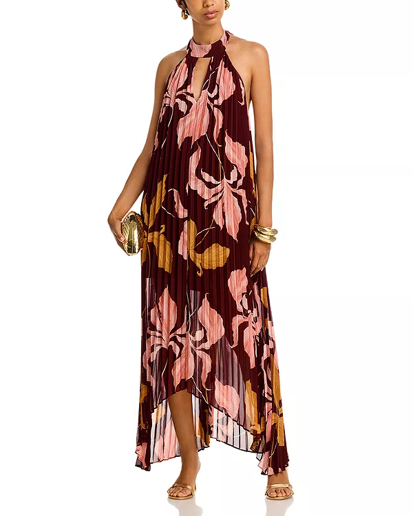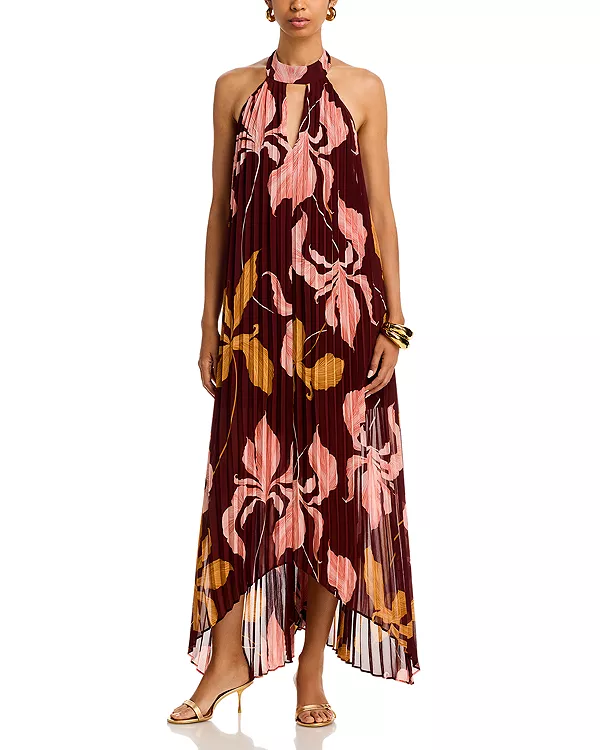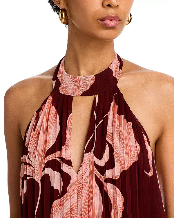 Принт по всей поверхности, плиссировка, вырез-капелька на шее спереди, открытая верхняя часть спины, асимметричный подол