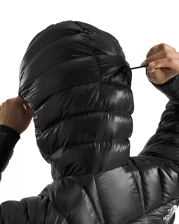 Прикрепленный регулируемый капюшон, совместимый с альпинистским шлемом, с предварительно натянутой эластичной резинкой и затягивающимся шнурком с фиксатором сзади.