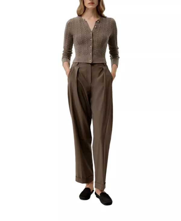 Бренд: Lilysilk Цвет: коричневый Эксклюзивность сочетается с нежностью - этот кардиган соткан из редчайшего в мире детского кашемира, волокна, известного своей невероятной мягкостью и теплотой. Каждая деталь, от скульптурной вязки косами до сияющих жемчужных пуговиц, тщательно продумана, чтобы подчеркнуть достоинства фигуры и придать ей изысканность. Укороченный до талии, он создает силуэт, одновременно современный и вневременной. Наденьте его и ощутите тихую роскошь, которая выглядит и ощущается так же индивидуально, как и ощущается на ощупь.