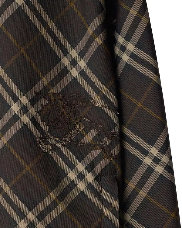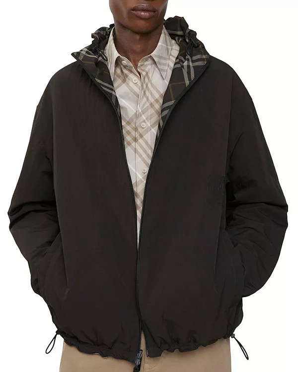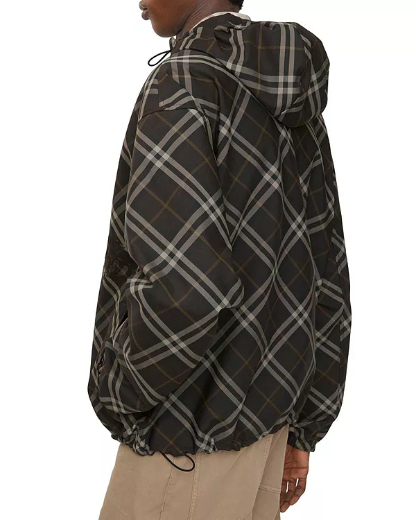 Бренд: Burberry Цвет: коричневый Легкая куртка из саржи, свободного кроя, с капюшоном на шнуровке. Двусторонняя модель: клетчатый узор Burberry сменяется однотонным зеленым нейлоном, а также украшена аппликацией в виде рыцаря-всадника в тон.