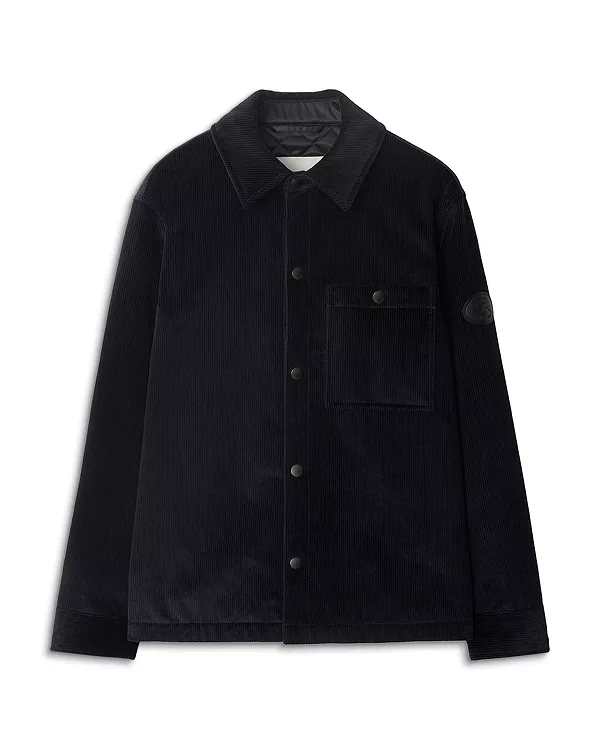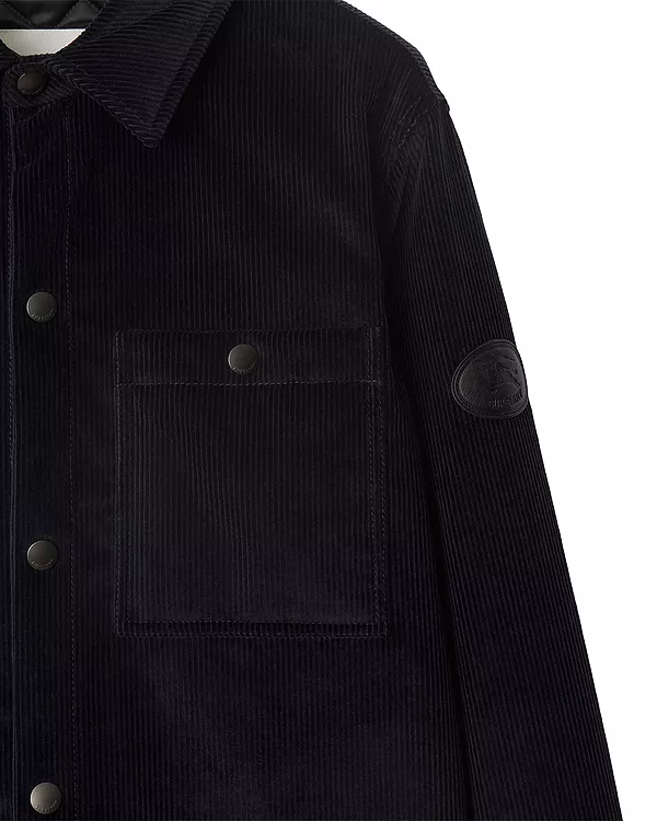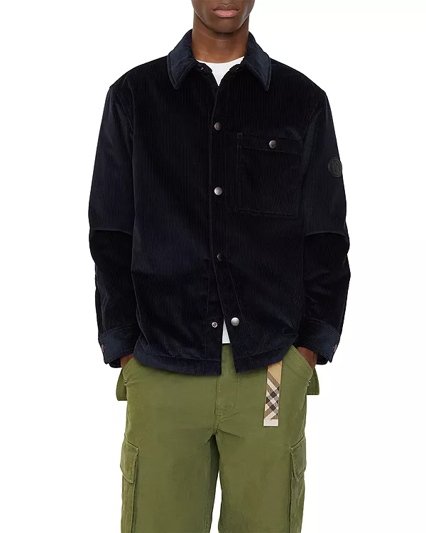 Рубашка из хлопкового вельвета со стеганой подкладкой. Модель имеет стандартный крой и украшена кожаной аппликацией в виде тиснения Knight, архивного мотива, впервые появившегося на сумках Burberry в 1980-х годах.