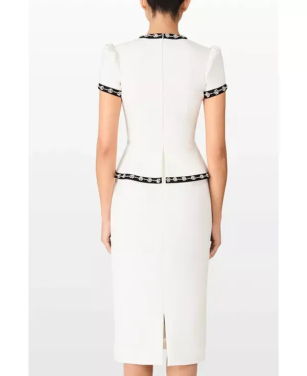 Бренд: Jenny Packham Цвет: белый Это платье, сшитое с исключительной точностью, представляет собой современную интерпретацию классической формальности. Силуэт структурированный и женственный, с короткими рукавами, приталенной талией и юбкой-карандаш длиной чуть ниже колена. Контрастная отделка, украшенная кристаллами и бантами, придает текстуру и индивидуальность строгим линиям. Смелое, но элегантное, это изысканный выбор для дневных мероприятий или для торжественных случаев.