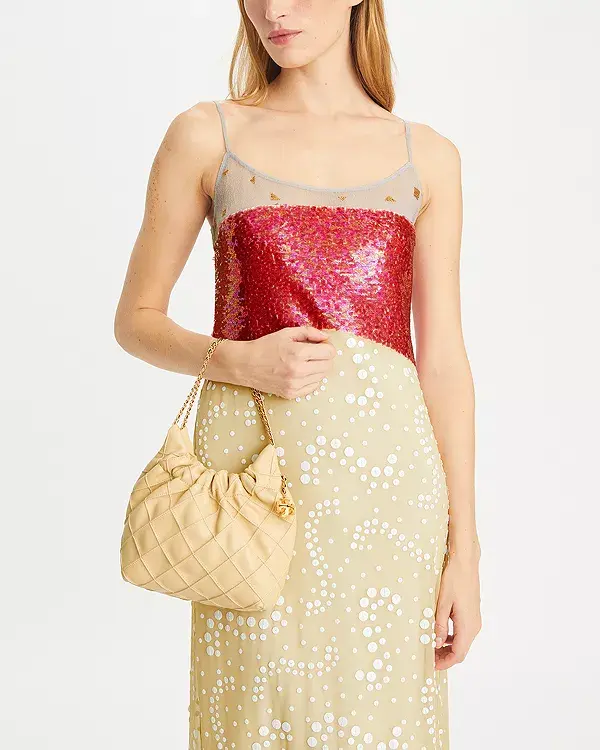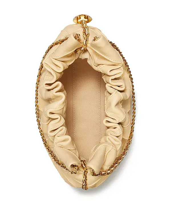 Мини-сумка Tory Burch Mini Fleming Hobo Bag, изготовленная из мягкой кожи, украшена складками в виде ромбов и цепочкой с кожаной шнуровкой.
