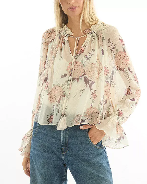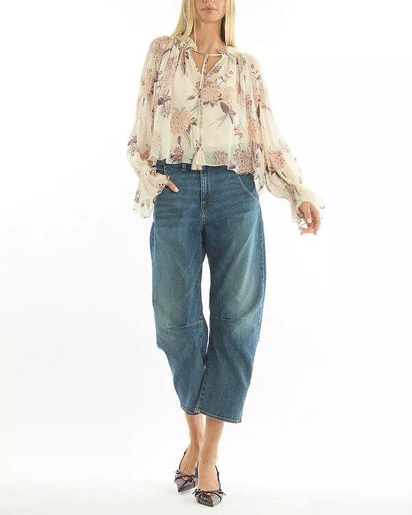 Блузка Katerina, изготовленная из 100% органического шелкового шифона с принтом Vintage Corsage, имеет присборенный вырез с завязками и пышные рукава. Легкая и элегантная, она включает в себя отдельную подкладку-майку и воплощает вневременное женское очарование.