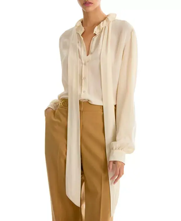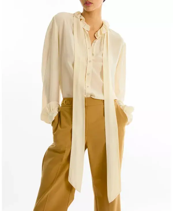 Блузка Maribelle, изготовленная из 100% органического шелкового крепа-жоржета, отличается струящейся драпировкой и мягкой текстурой. Благодаря завязкам на шее, потайной планке и присборенным манжетам, она сочетает в себе изысканный крой с непринужденной и вневременной элегантностью.